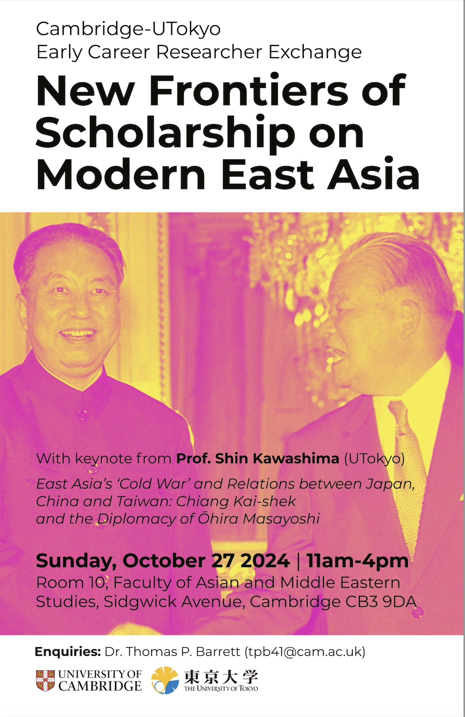 10月末にケンブリッジ大学にてワークショップを開催します。 2024 10/09 登壇│talks 2024年10月6日 2024年10月9日 10月末にケンブリッジ大学にて以下のようなワークショップを開催します。 登壇│talks URLをコピーしました! URLをコピーしました! シンガポールのThink Chinaに小論が掲載されました。 11月2日に福岡で「歴史としての冷戦終焉-ポスト冷戦の視座から-」という公開シンポジウムを実施します。