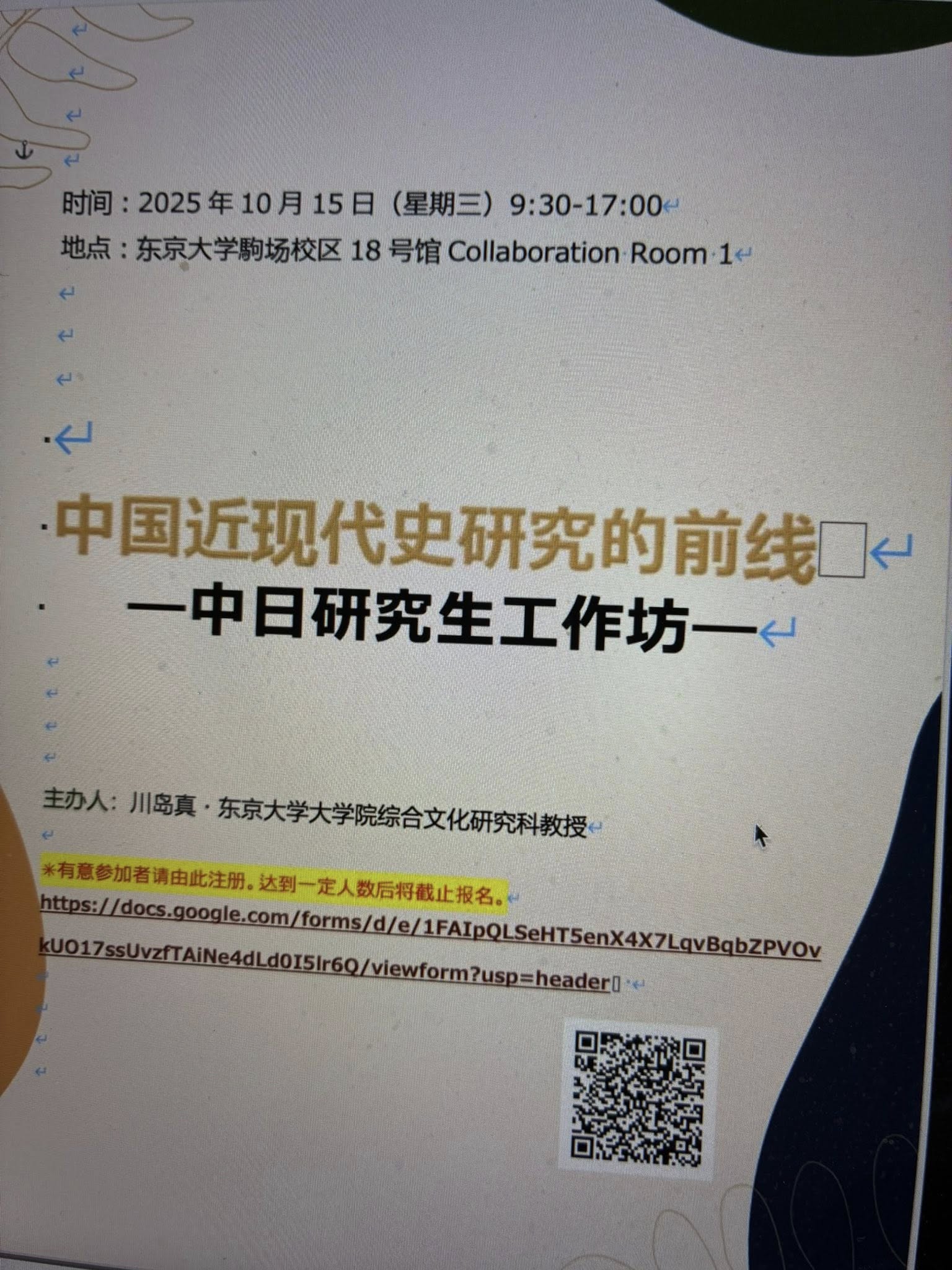 10月15日(水)に駒場にて、日中の中国近現代史研究に関わる大学院生のワークショップを開催します。登録が必要になりますが、奮ってご参加ください。