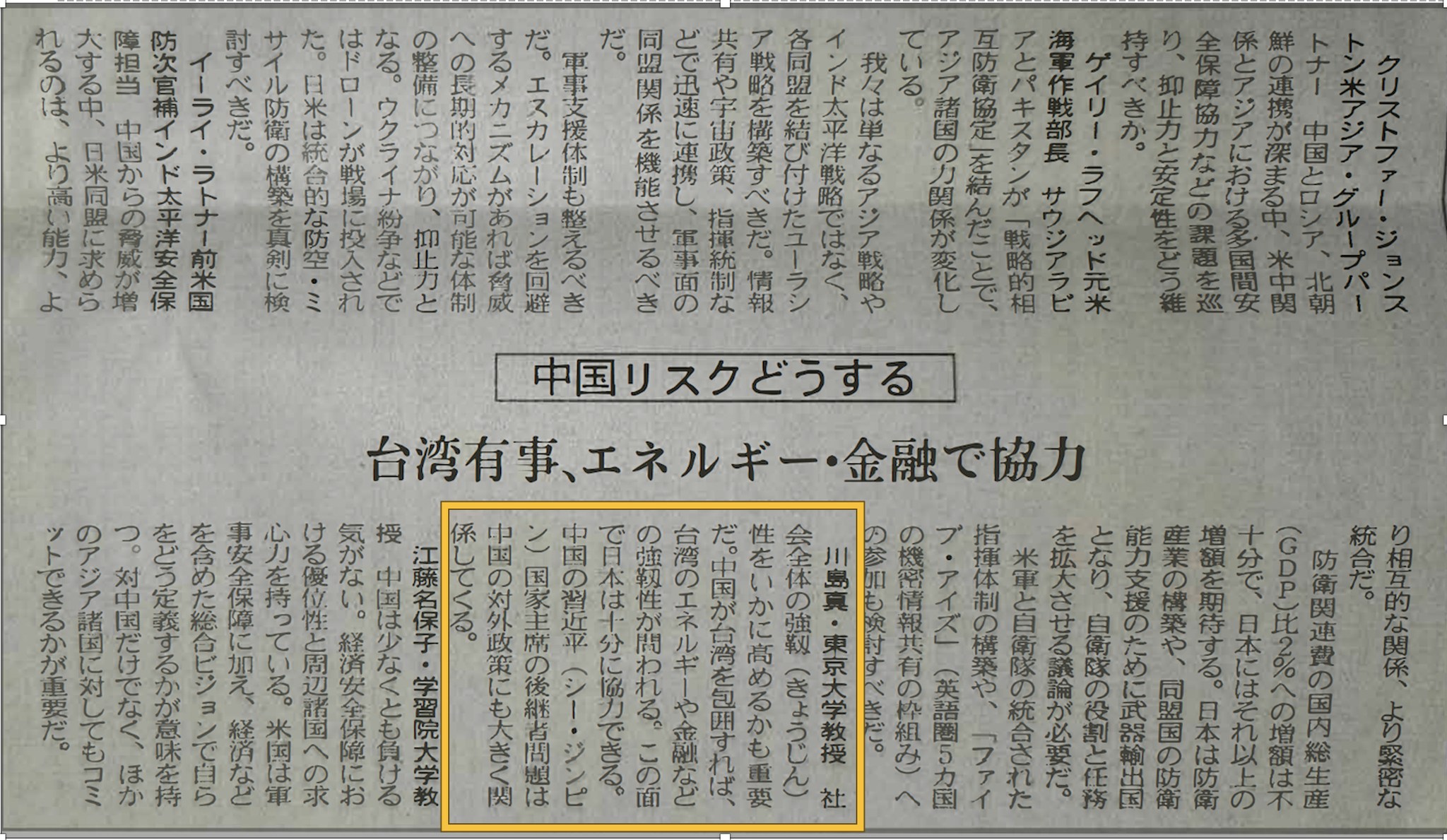 富士山会合のパネル討論2「中国リスクをいかにマネージするか」にてパネリストを努めました。 2025 11/10 登壇│talks 2025年10月26日 2025年11月10日 【11月10日更新】 昨日11月9日の日経に先日の富士山会合の模様が掲載されました。私の発言が要約されています。 【10月26日投稿】 富士山会合のパネル討論2「中国リスクをいかにマネージするか」にてパネリストを努めました。首脳会談を通じて習近平と話すことが重要、東アジアでいかに戦争を起こさないかという考えに基づく施策が必要、といったことを最後に言おうと思っていたら、時間切れで最後の一巡がなくなってしまいました。言いたいことは先に言うべきですね。 登壇│talks URLをコピーしました! URLをコピーしました! 中曽根平和研と台湾の遠景基金会との日台フォーラムに参加、報告しました。サイバーや経済安保など広範な問題について議論でき有意義でした。 10月29日の『朝日新聞』(夕刊)に樫山純三賞についての記事が紹介され、その中で今年度の選考委員代表としてのインタビュー記事が採録されました。