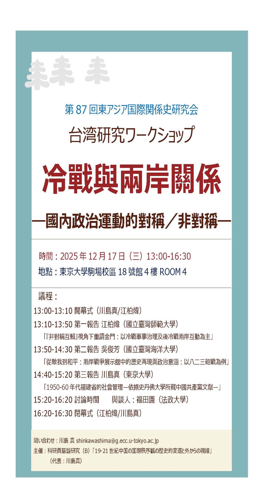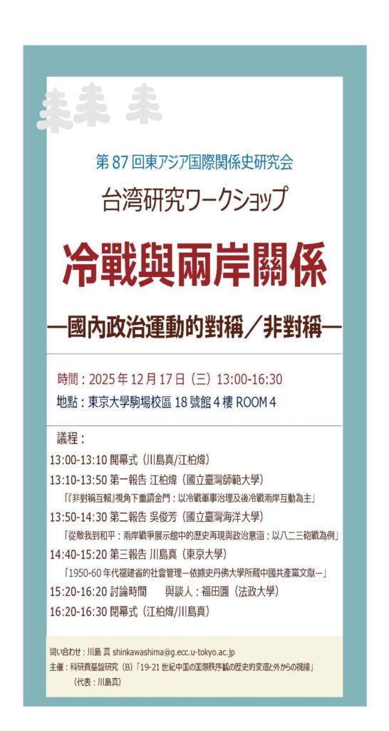 2025年12月17日にワークショップを開催します。 2025 11/21 研究会 2025年11月21日 2025年11月21日 2025年12月17日、次のようなワークショップを開催します。 第87回東アジア国際関係史研究会 台湾研究ワークショップ「冷戰與兩岸關係 國內政治運動的對稱/非對稱」日期:2025年12月17日(三)13:00-16:30地點:東京大學駒場校區18號館4號Room4 研究会 URLをコピーしました! URLをコピーしました! 本日朝、7時過ぎから日中関係についてお話ししました。 【11月28日】今週末、神奈川大学のエクステンション講座でお話しします。