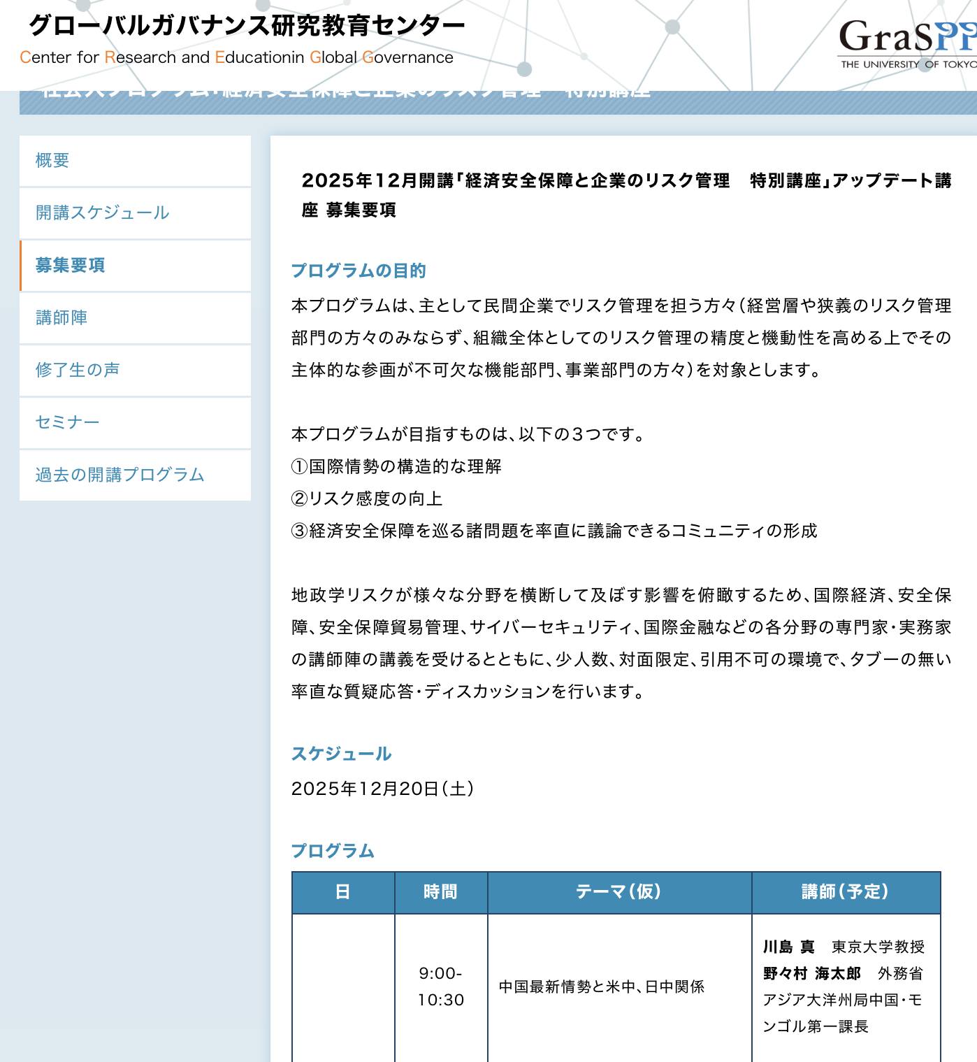昨日12月20日は東大の公共政策大学院で朝9時から講演でした。 2025 12/21 登壇│talks 2025年12月21日 2025年12月21日 昨日は東大の公共政策大学院で朝9時から講演でした。外務省のアジア大洋州局中国・モンゴル第一課長から多くを学ばせていただきました。関係者の皆様に感謝します。 登壇│talks URLをコピーしました! URLをコピーしました! 来年2月末に刊行される『東大現代中国学』にて、第1章の執筆を担当しました。 毎日のエコノミストに小論が掲載されました。