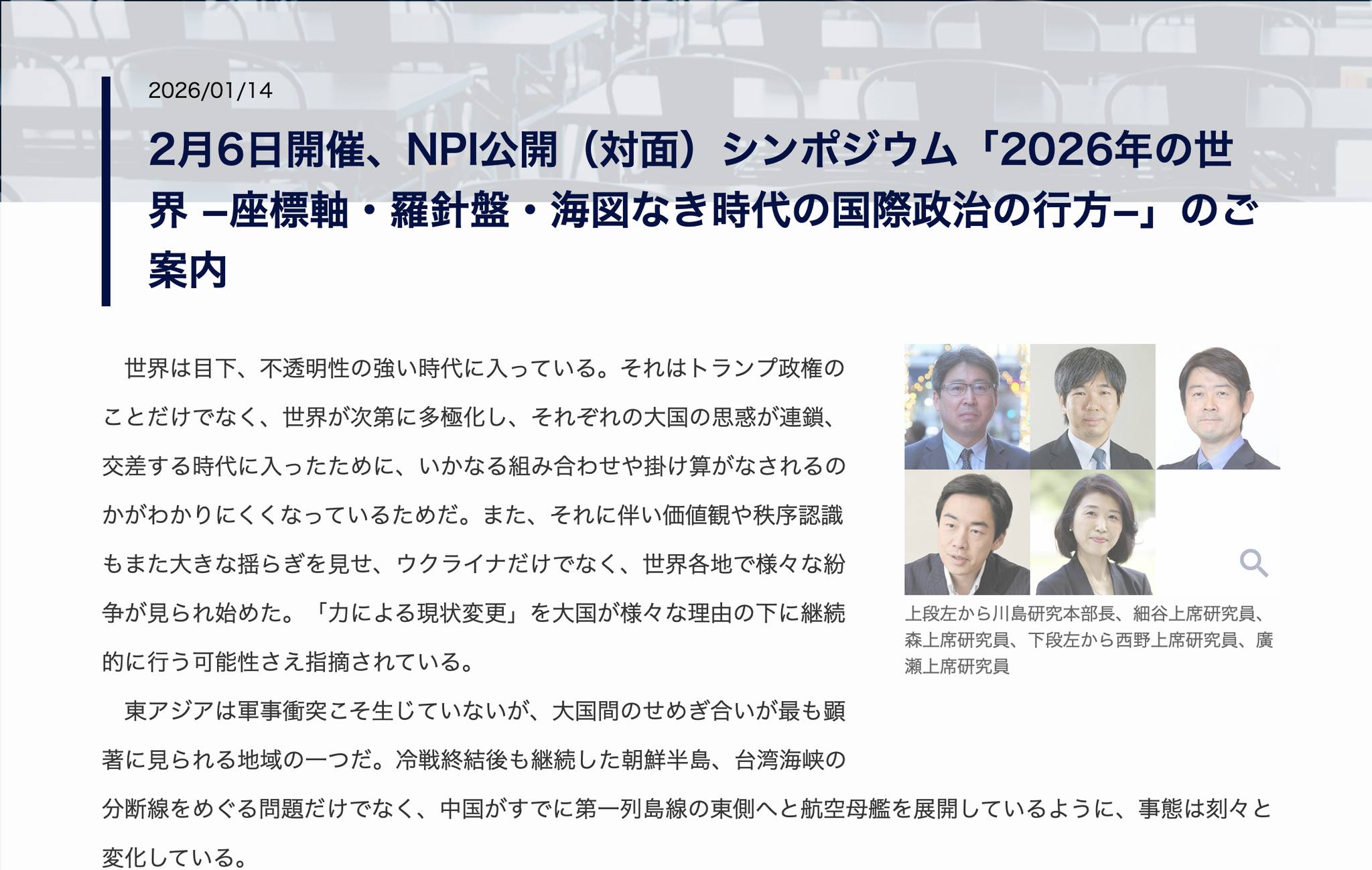 【2月6日】次のような対面シンポジウムを実施します。奮ってご参加ください。 2026 1/14 登壇│talks 2026年1月14日 2026年1月14日 2月6日に、次のような対面シンポジウムを実施します。奮ってご参加ください。 リンクはこちら。申し込みリンクはこちら。 NPI公開(対面)シンポジウム「2026年の世界 −座標軸・羅針盤・海図なき時代の国際政治の行方−」 登壇│talks URLをコピーしました! URLをコピーしました! 随分と前に受けたインタビューが日経BPで公開されました。 「中国学.com」に掲載されていた小論が英訳されて日本国際問題研究所のウェブサイトで公開されました。