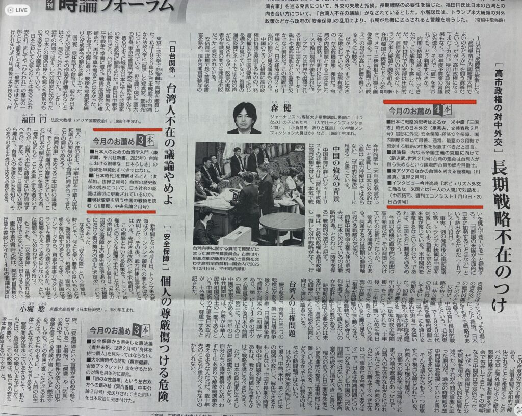 1月29日の『毎日新聞』の時論フォーラムにて、『中央公論』と『世界』に書いた拙稿をそれぞれ取り上げていただきました。 2026 1/31 その他│etc 2026年1月31日 2026年1月31日 1月29日の『毎日新聞』の時論フォーラムにて、『中央公論』と『世界』に書いた拙稿をそれぞれ取り上げていただきました。 その他│etc URLをコピーしました! URLをコピーしました! 日本台湾交流協会の機関誌『交流』に寄稿しました。 日経新聞の「Think!まとめ読み」に選んでいただきました。