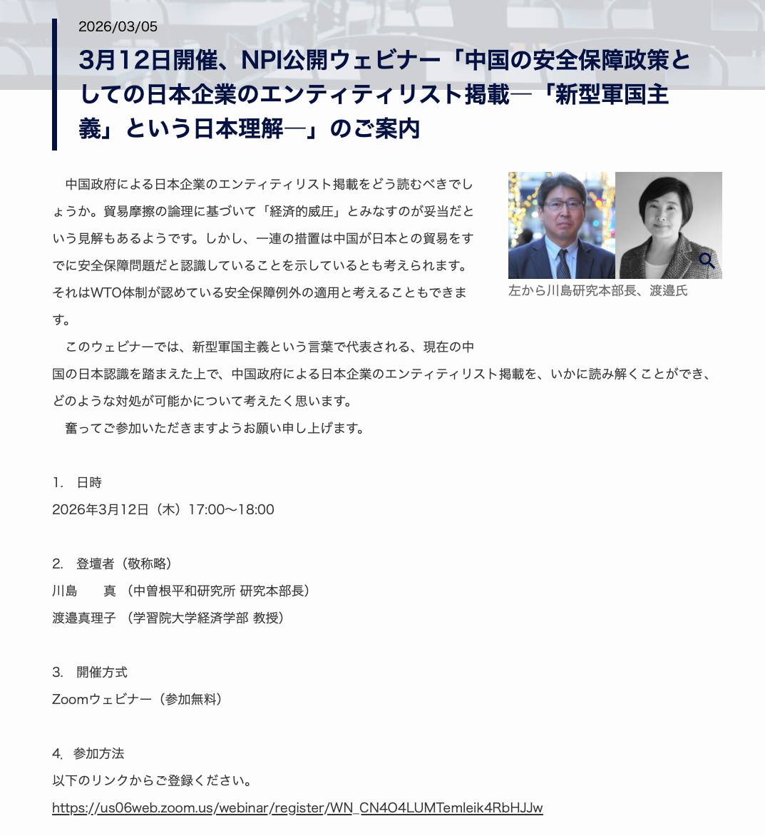 【3月12日17時】渡邉真理子先生との対談をWebinarで行います。 2026 3/06 登壇│talks 2026年3月6日 2026年3月6日 2025年3月12日、17時から渡邉真理子先生との対談をWebinarで行います。奮ってご参加ください。 1. 日時2026年3月12日(木)17:00~18:00 2. 登壇者(敬称略)川島 真 (中曽根平和研究所 研究本部長)渡邉真理子 (学習院大学経済学部 教授) 3. 開催方式Zoomウェビナー(参加無料) 4.参加方法以下のリンクからご登録ください。 登壇│talks URLをコピーしました! URLをコピーしました! 【5月15日】東北大学東北アジア研究センター成立30周年の記念式典で講演させていただくことになりました。 マーシャル諸島での調査を終えました。
